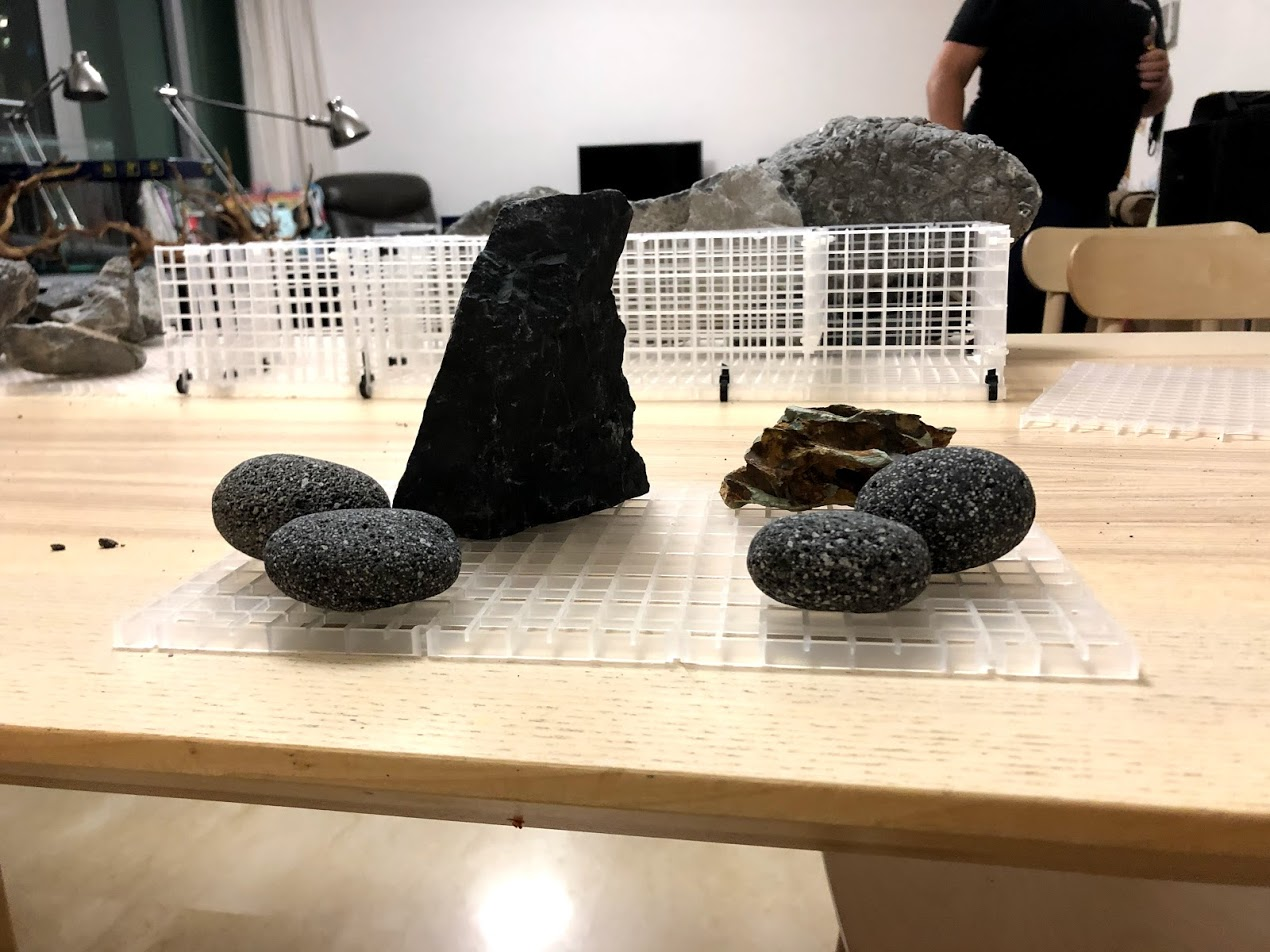 MsC still hasn't settled on her design. She tried at least 10, taking pictures of each version so she can choose later. MsI doesn't have a fish tank, but she wasn't about to be left out. We handed her a spare piece of grid and she had fun piling rocks on it.
