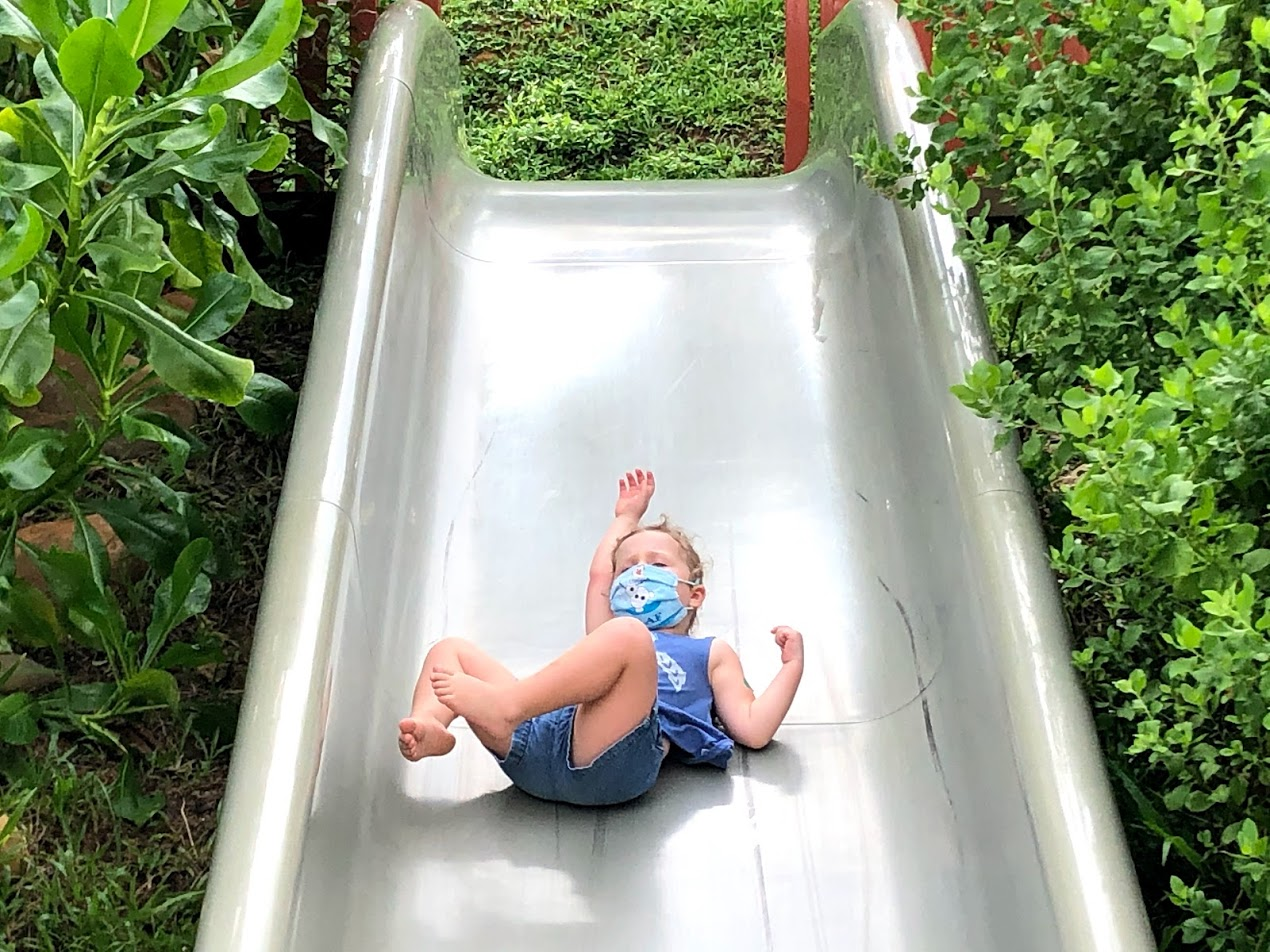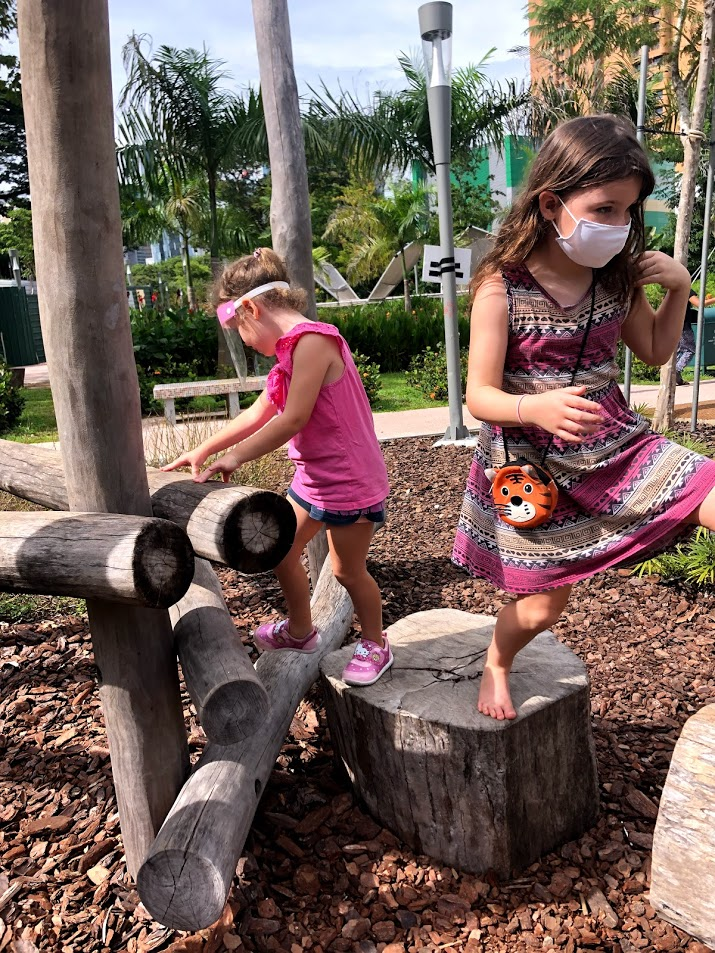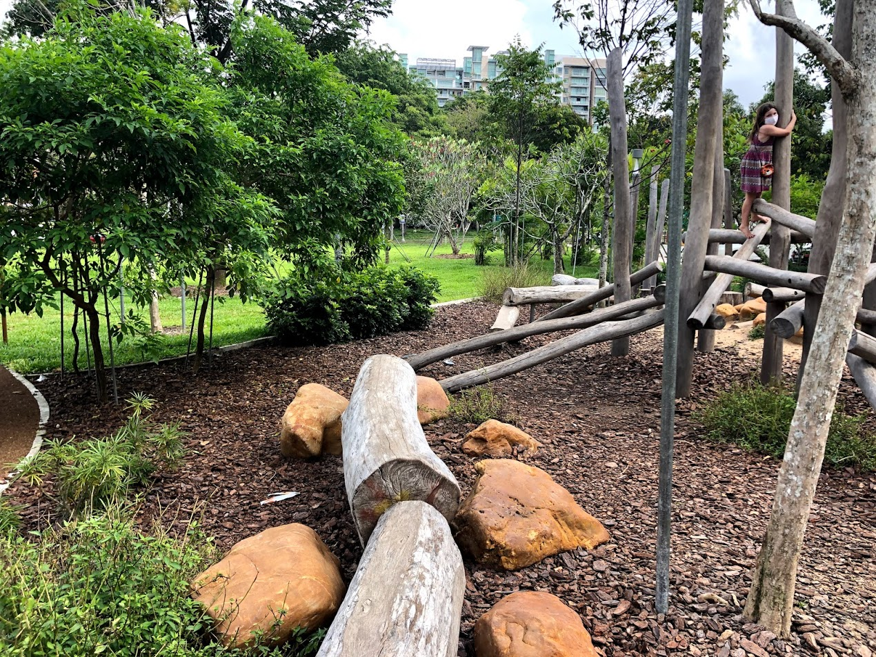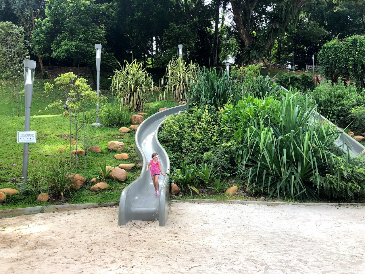The MRT was quiet on a mid-day weekday. After transferring to a new MRT line, we found the park easily. It's right beside the MRT station. This park is right near where we first stayed when we moved to Singapore and it felt so familiar to be back here. There are all these slides built right into the hillside to ride down and lots of climbing structures. Our favorite climbing one was roped off closed, but other than that everything was as we remembered it, except the foliage was a little more grown up.