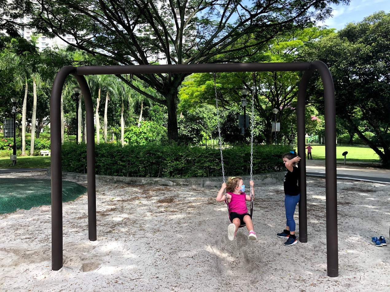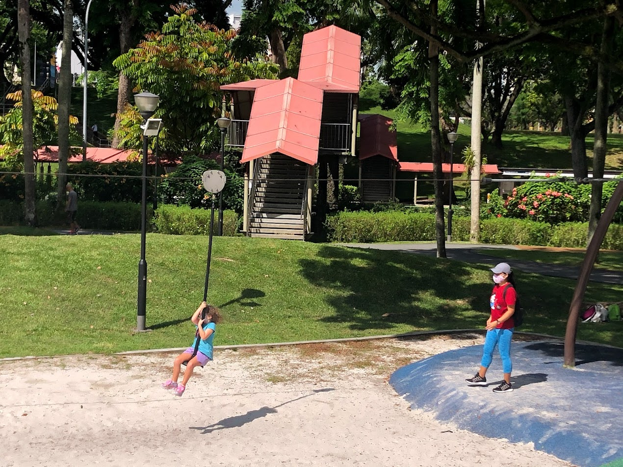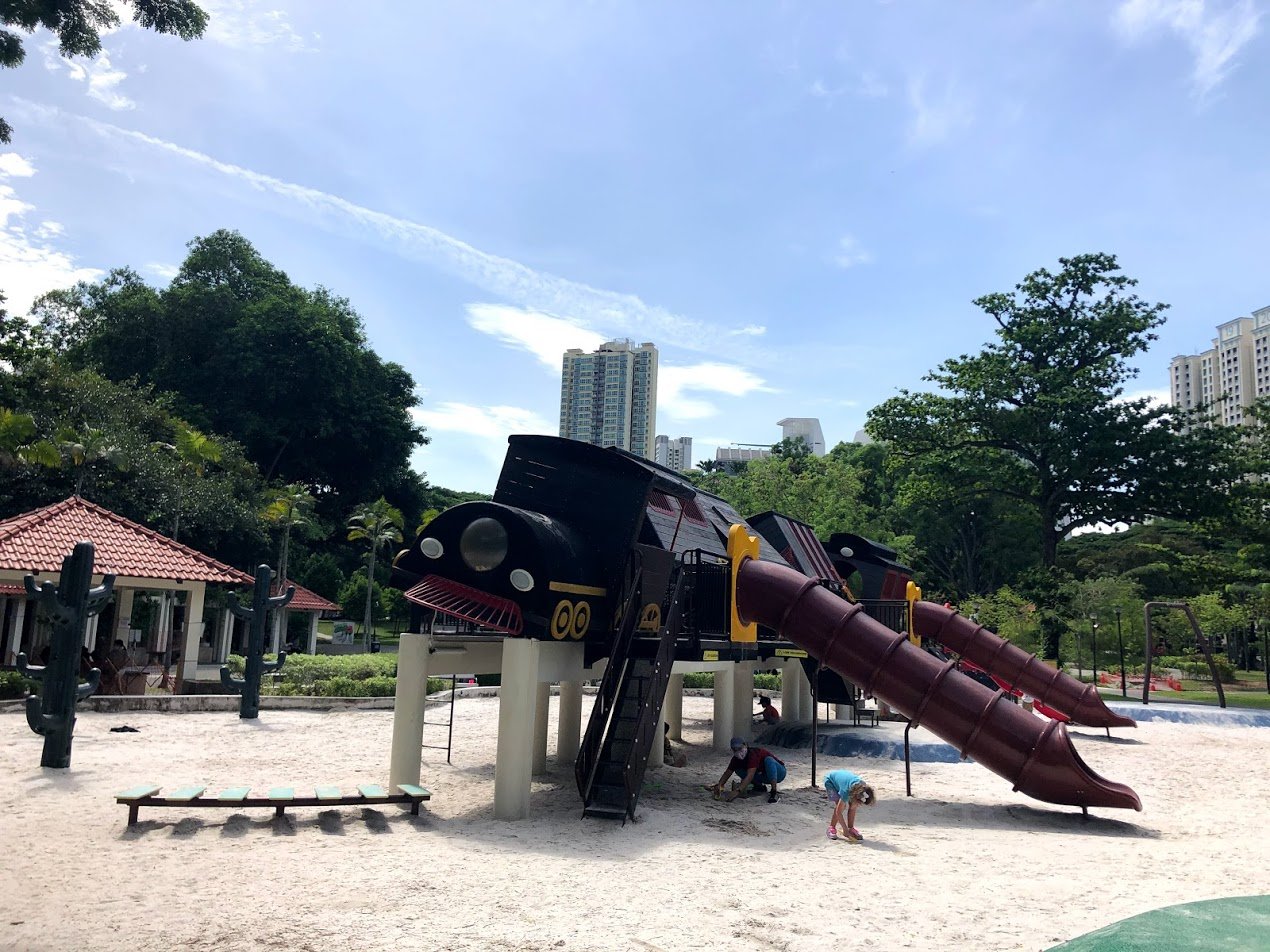 5 stops on the bus and we were at Tiong Bahru Park. We didn't even bring a stroller. We climbed along the twisted train playground, zipped along the zip lines, and dug in the shady sand under the train.