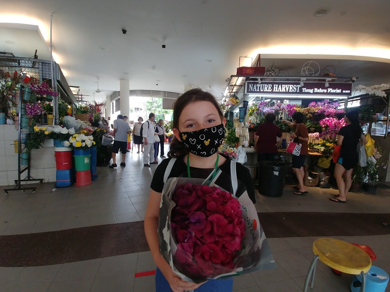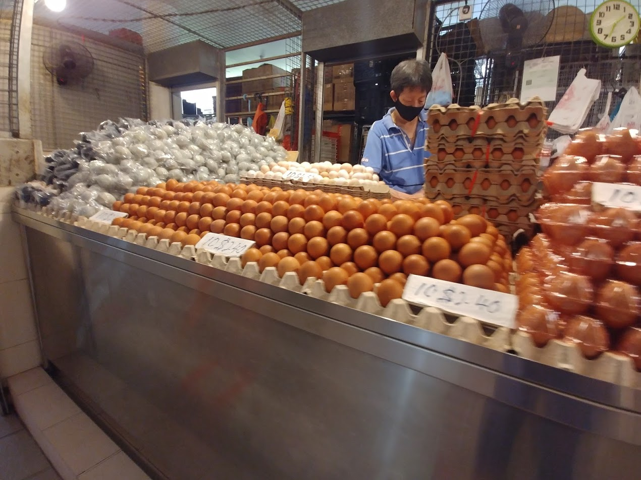 After lunch we headed across the street to the Wet Market, we checked out the fresh produce and then bought fresh flowers. We spent a while marvelling at all the egg stall. There were so many sizes and colours. We saw signs for chicken, duck and quail eggs. Our favorite was small and pale blue in colour. We should have asked what it was laid by. As you might notice in the photo below, eggs are sold in sets of 10 in Singapore.