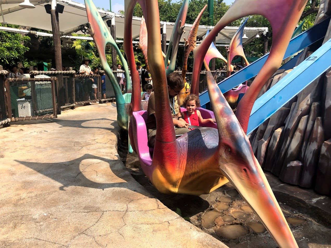 Lost World Jurassic Park was probably our favorite land. Everyone did Dino Soaring here. This is one of those rides where I was surprised to need one adult per preschooler. This is because you are only allowed two people per pterosaur (which mean one adult and one child). Ms.C was tall enough to go in a pterosaur all on her own, so our whole family was able ride at the same time.
