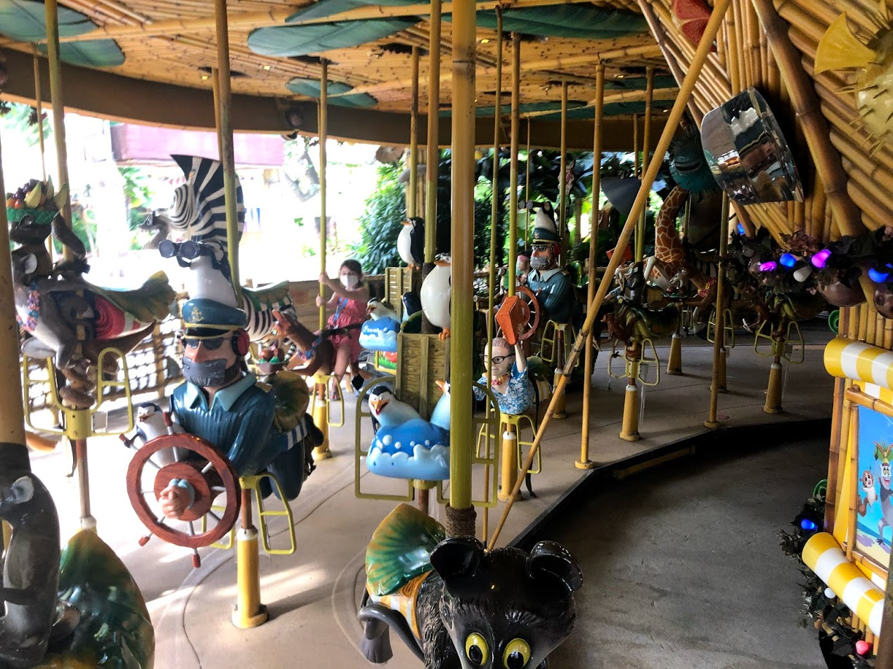 Some of the logic I just couldn't figure out. Take the Madagascar Carousel: I'm guessing they were letting on 25% of the riders they could, but it actually seemed significantly less than that. None of the seating was blocked out so the 15 or so people they let on at one time got on the first seats they saw with most people leaving some space between themselves and other parties.