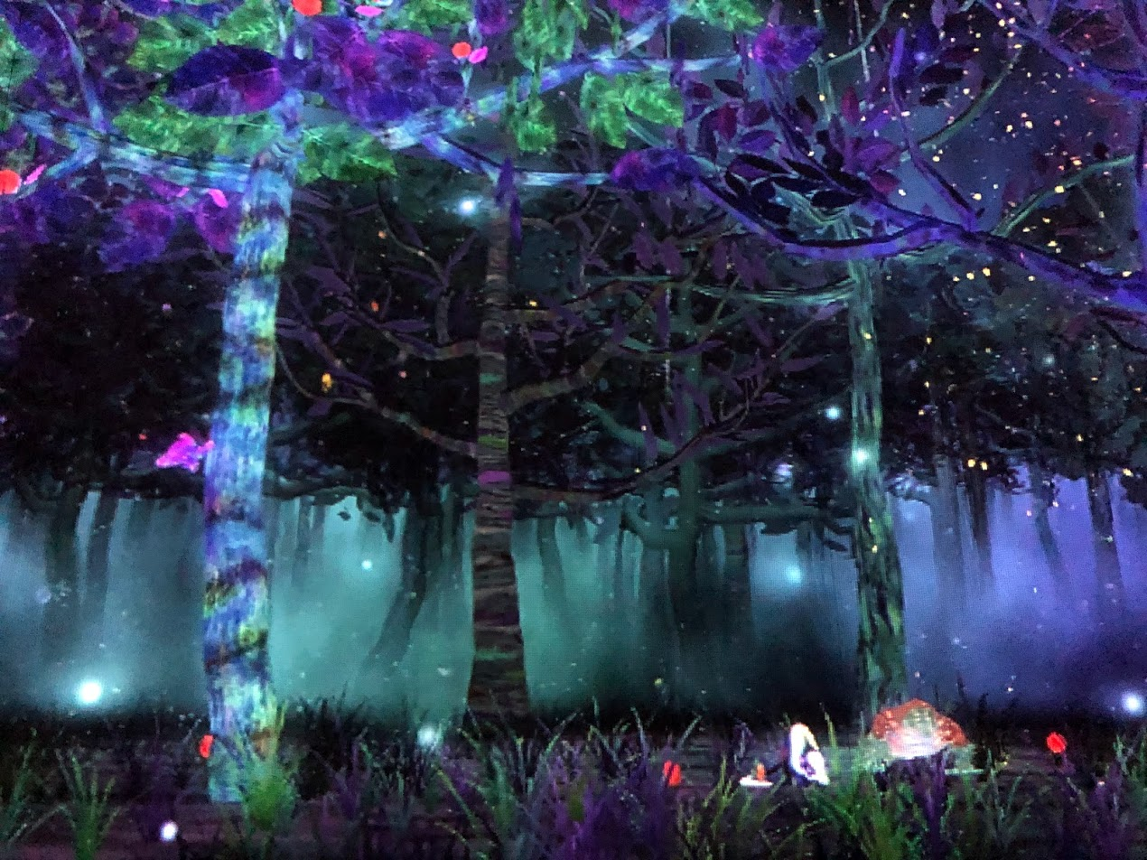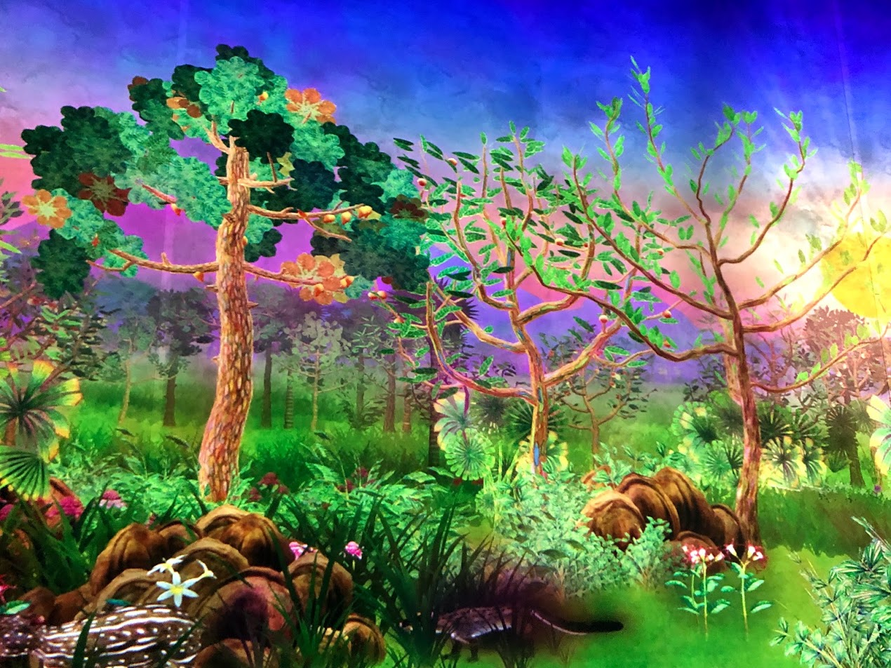 The exhibit walks you though a magical forest illustrating Singapore's ancient days with gently drifting floor to ceiling pictures. Images of flowers and "Fairy dust" (as the kids called it) appear to float down from the ceiling. Soft music is playing. It's very serene.