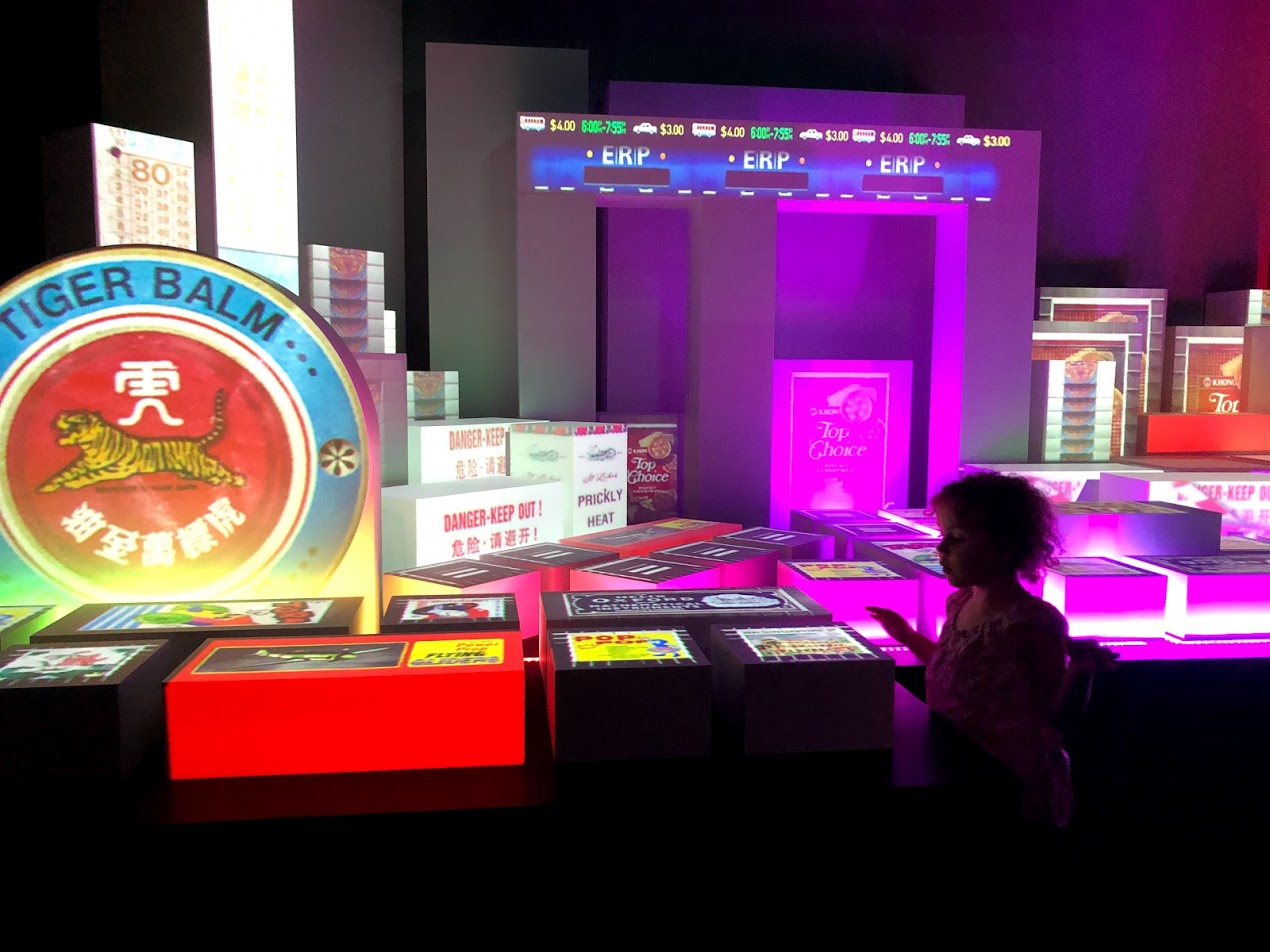 We wove our way through the British era, and found ourselves in a hallway of rattan hats and baskets. We slipped quickly through the war era - Ms.E found the lighting creepy there. The kids bypassed the factory era altogether. We stepped inside a model of the first HDBs (apartments) in Singapore from the 50s/60s. We lay down on the astroturf in the "park" highlighting Singapore as today's "Garden City".