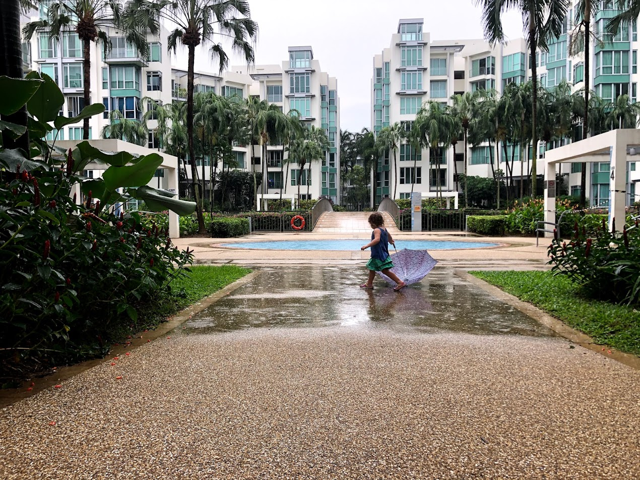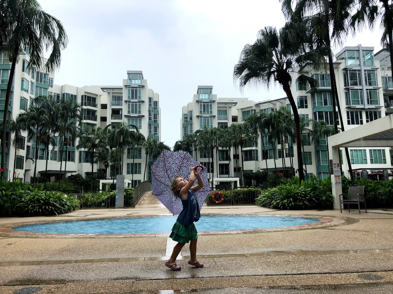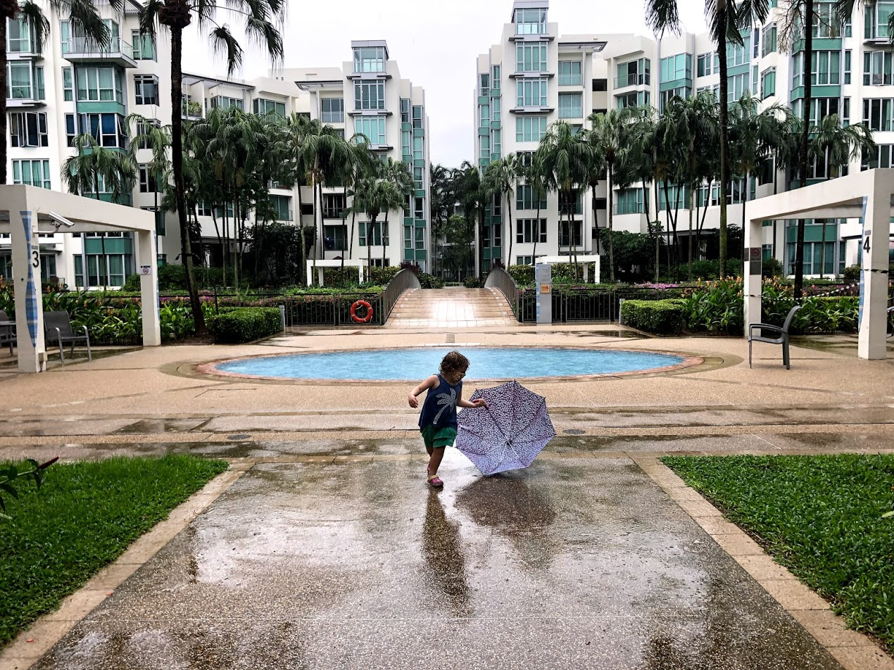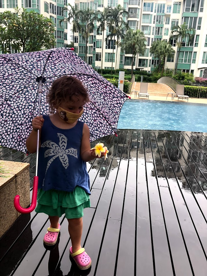 I actually love rainy days. I could almost pretend this is the beginning of Autumn back home. In Singapore this season often has rainy afternoons and stormy nights. This means we almost always get to go to the pool in the morning, but our afternoon playground time often gets rained out.