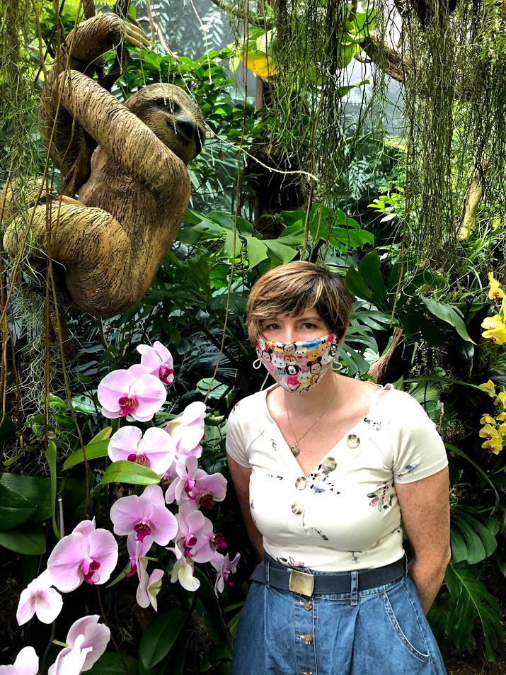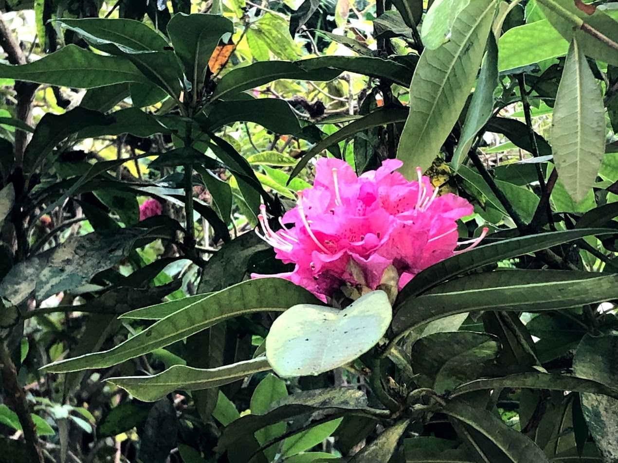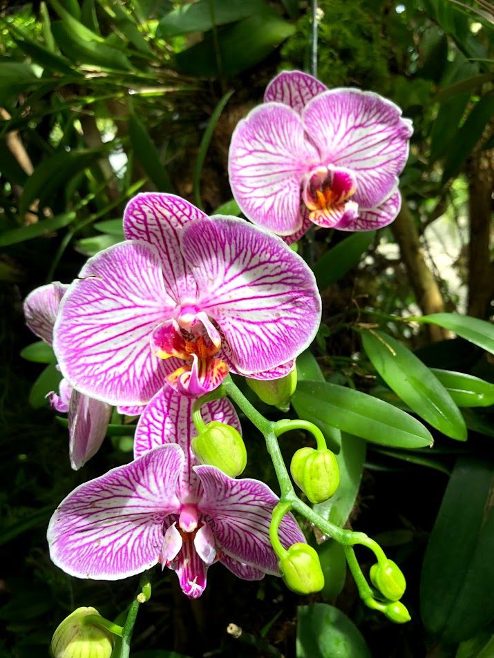 In the lower elevations we passed African Violets in the ground cover, Rhododendrons left to grow as full tall trees, and of course a large variety of orchids. My favorite spot in the whole greenhouse is the narrow tunnel you walk through filled with dangling orchids.