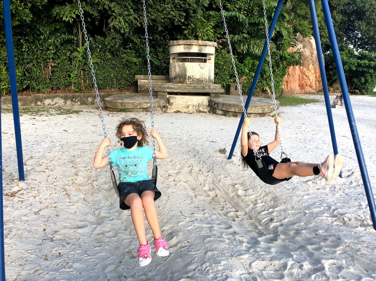 To get to the Sand Playground, you have to enter the Nature Park and pass the trees where the monkeys live, and MsE knew it. MsE recently learned to pump with her feet on the hammock in the playground, but she really wanted to try it on "real" swings like they have in Labrador Park. She decided with her new knowledge of what to do if you see a monkey, that it was worth the risk.