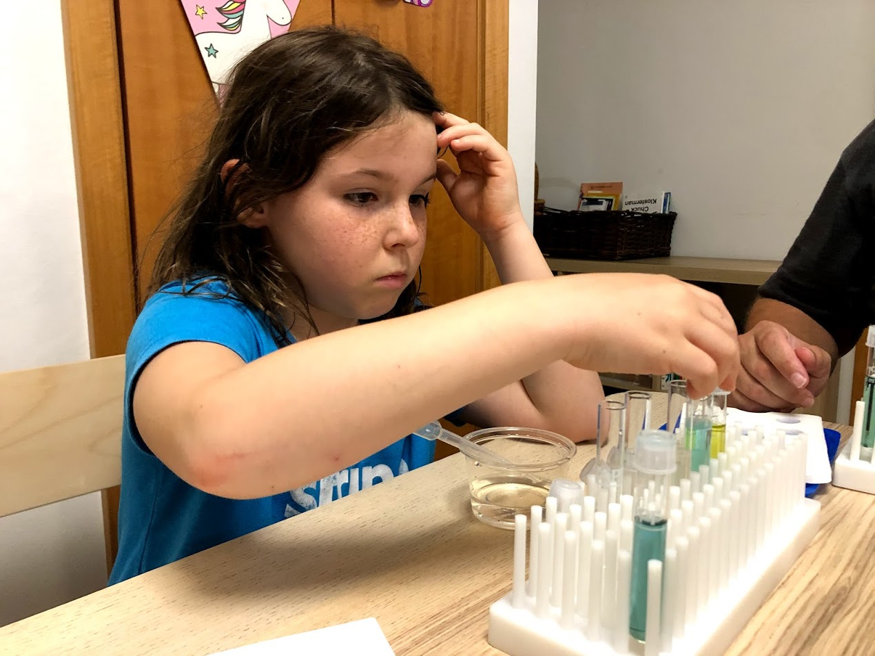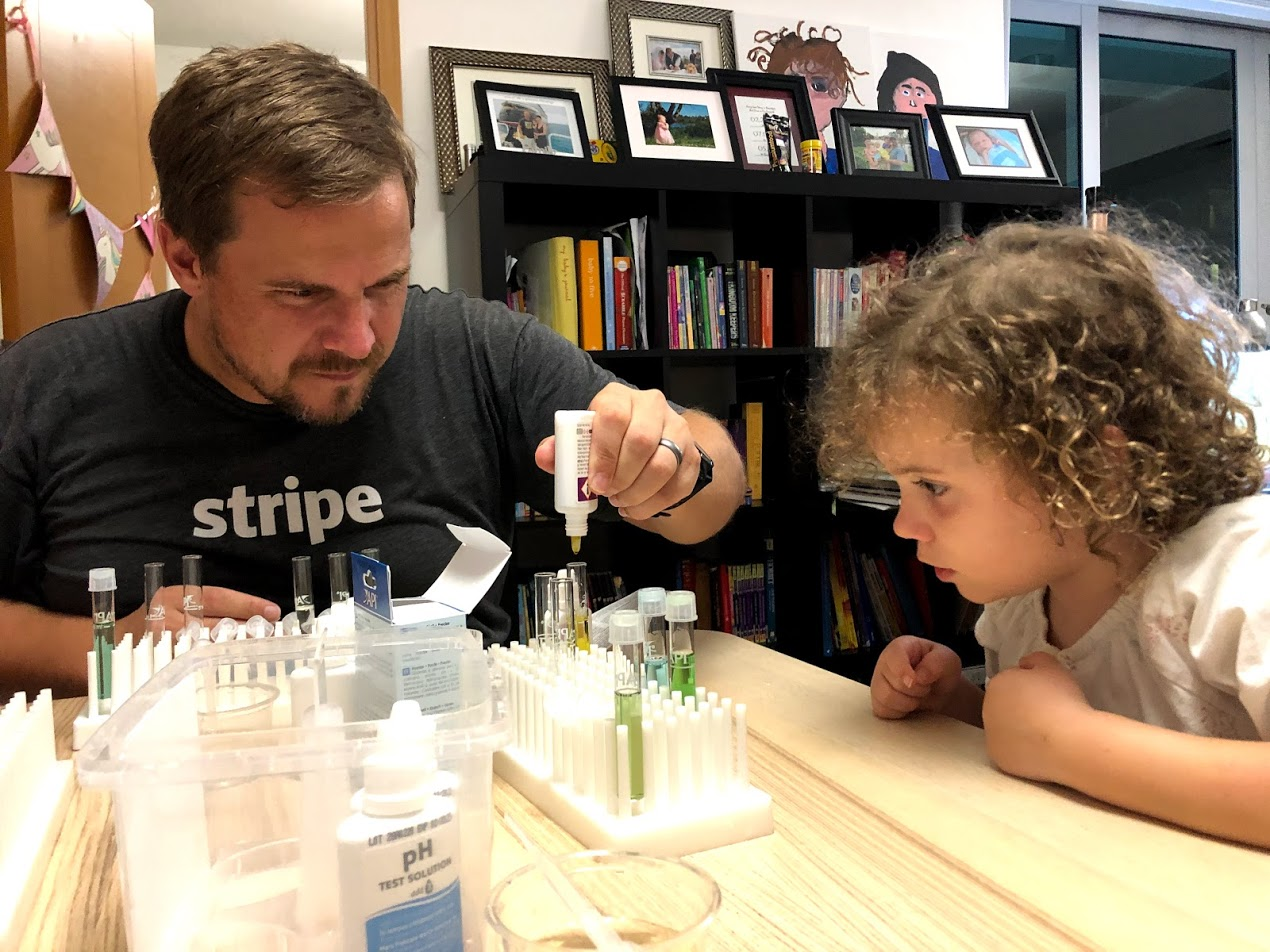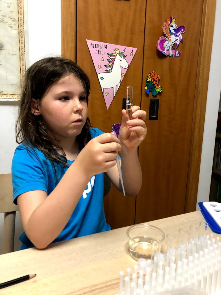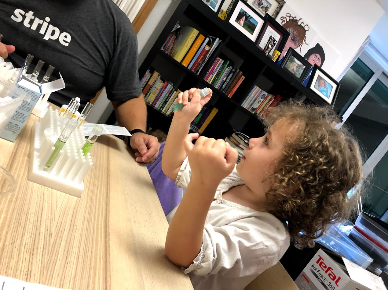 They're taking it all so serious. MsC told me, "Daddy says it needs it to be exact." The girls learned about meniscus (the curve of water when it sticks to the glass at the sides of the tube). The girls use the pipette to add just the right amount of water to each test tube. The kids count the drops while Jonathan adds them to each test tube. Test tube shaking is pretty fun though and the colours are pretty.