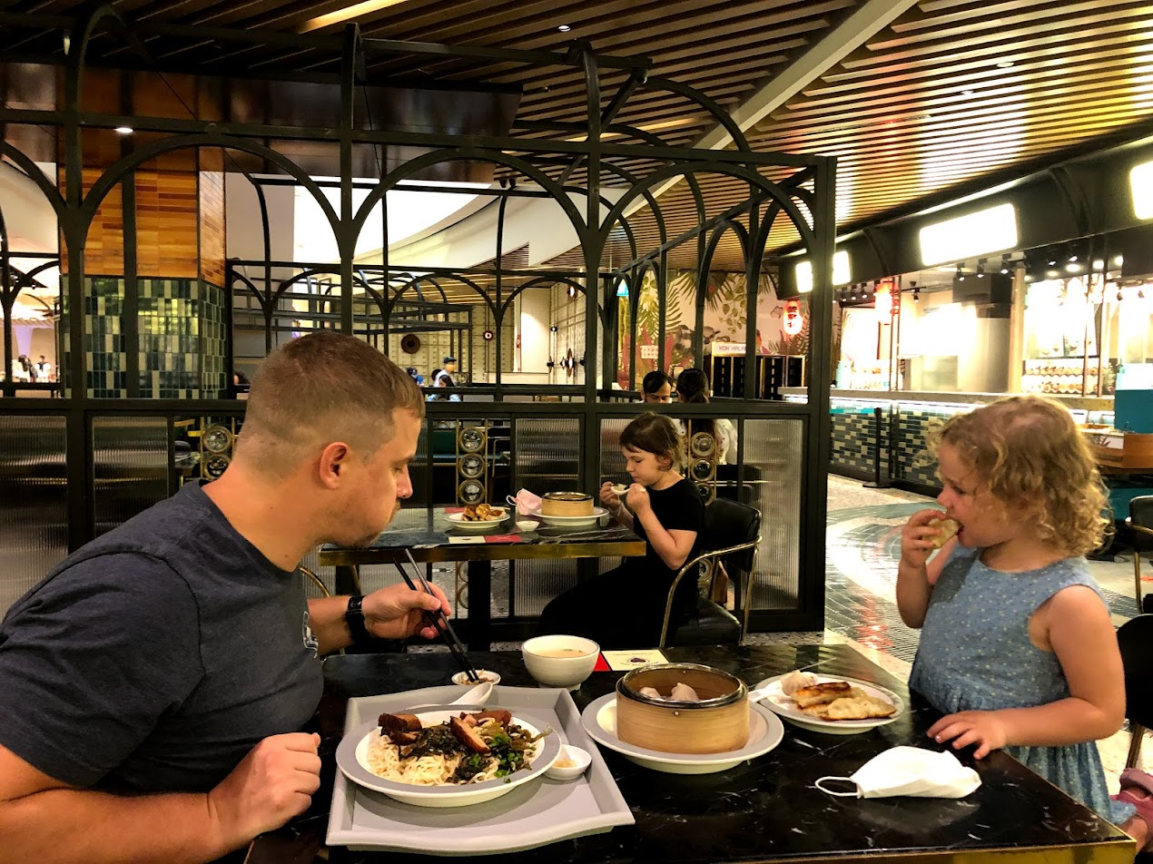 We grabbed early dinner in the mall, eating our favorite foods in the Food Court. MsI, MsC and Jonathan celebrated finding Xiao Long Bao (Soup Dumplings). MsI found hotdogs baked inside buns at a Bakery Stand. I found soup. The group size allowed for Dining Out was still 2 people so we had to sit 2 - 2 - 1 with a table or a gap in between each of our groups. Luckily it wasn't busy so we were able to get tables in a row.