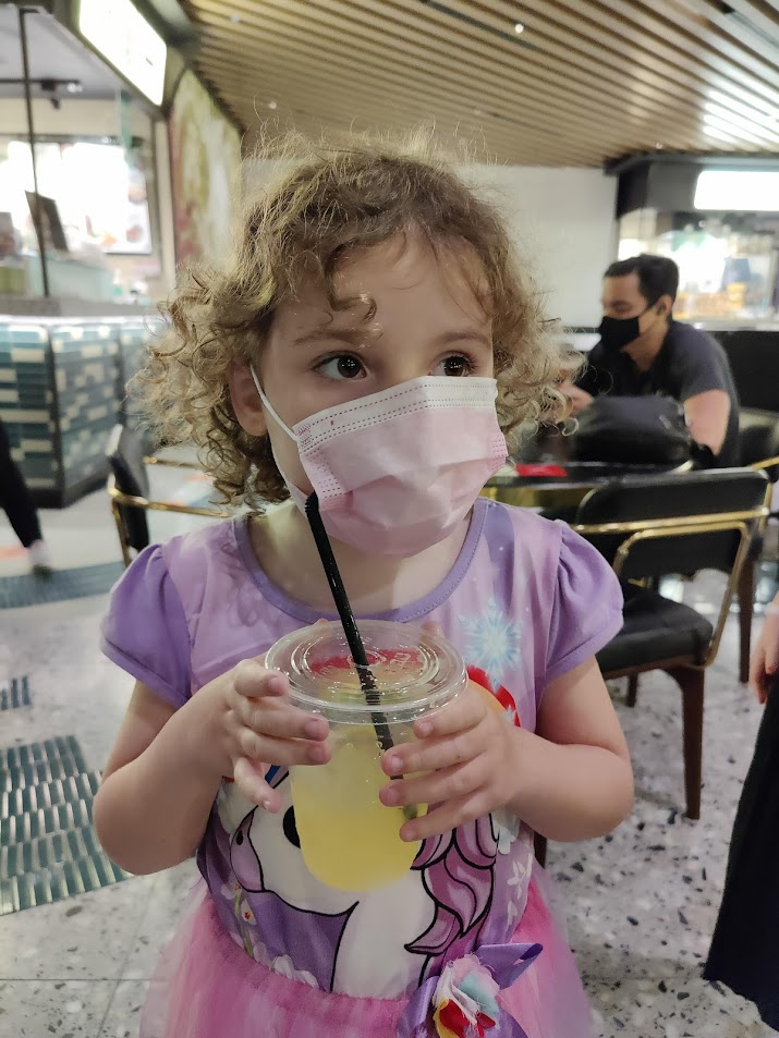 MsE innovated how to drink with a mask on so she could walk through the mall. See the angled straw out the side. She was very proud of herself.